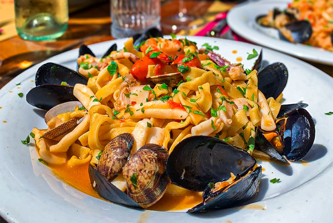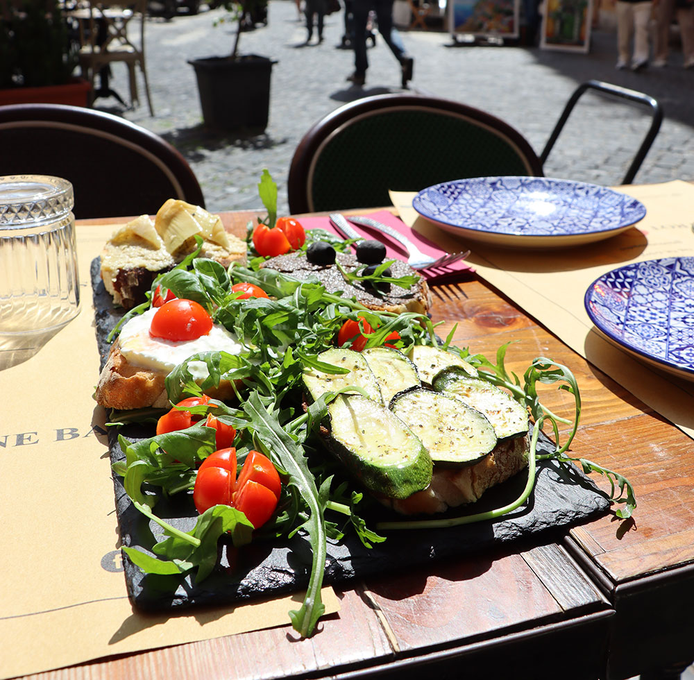 Una colazione all’italiana con cappuccino e cornetto, un pranzo tra piatti tipici e sapori veri, un aperitivo con spritz e bruschette mentre il sole tramonta sui vicoli romani.